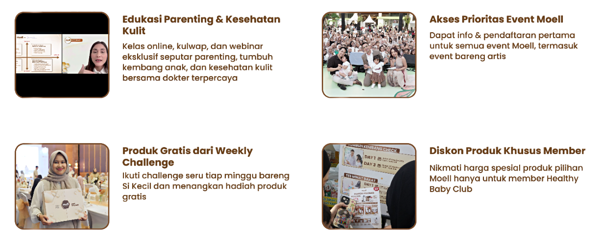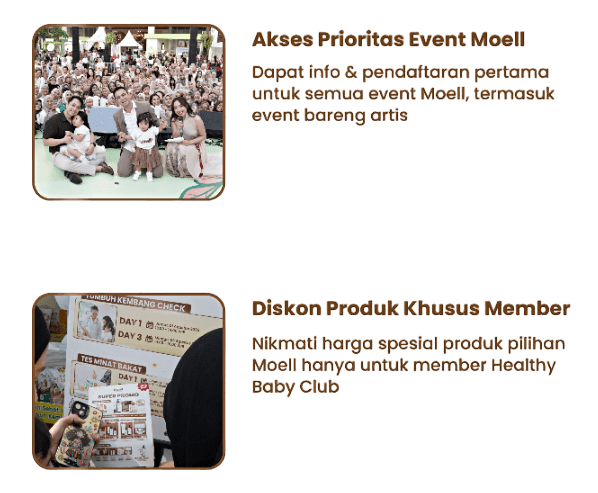 Moell Healthy Baby Club, komunitas yang mensupport Ibu sekaligus Si Kecil untuk mendukung tumbuh kembang yang optimal. Yuk gabung di Moell Healthy Baby Club, perjalanan orangtua menjadi lebih mudah